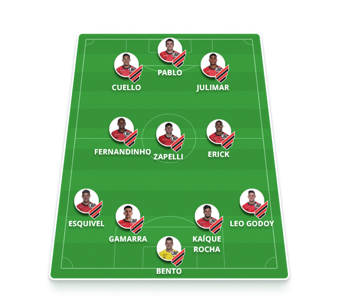 Provável escalação do Athletico: Bento; Léo Godoy, Kaique Rocha, Gamarra e Esquivel; Fernandinho, Erick e Zapelli (Felipinho); Canobbio, Julimar (Cuello) e Pablo (Mastriani).