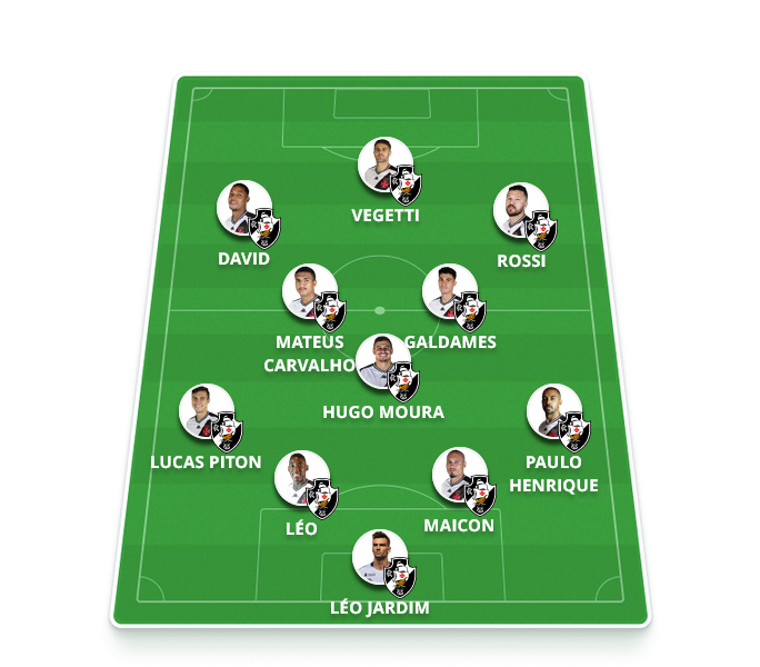 Provável escalação do Vasco: Léo Jardim, Paulo Henrique, Maicon, Léo, Lucas Piton; Hugo Moura (ou Sforza), Mateus Carvalho, Galdames; Rossi, David e Vegetti.