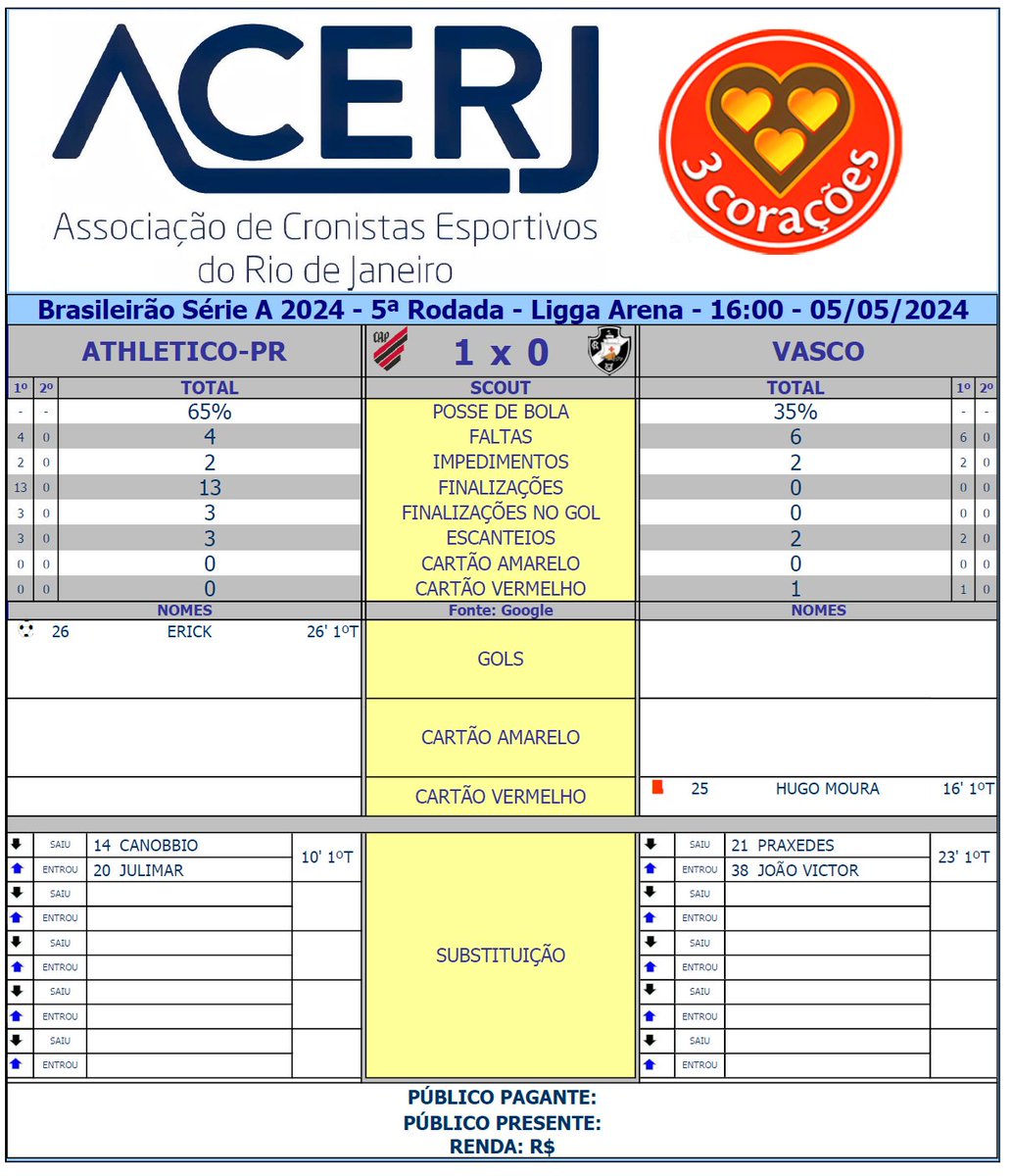 Scout do 1º Tempo de Athletico-PR e Vasco pela 5ª Rodada do Campeonato Brasileiro 2024 na Liga Arena (Fonte: Google) #Acerjinforma #brasileirao2024 #CAPxVAS #AthleticoPR #Vasco @Brasileirao @AthleticoPR @VascodaGama