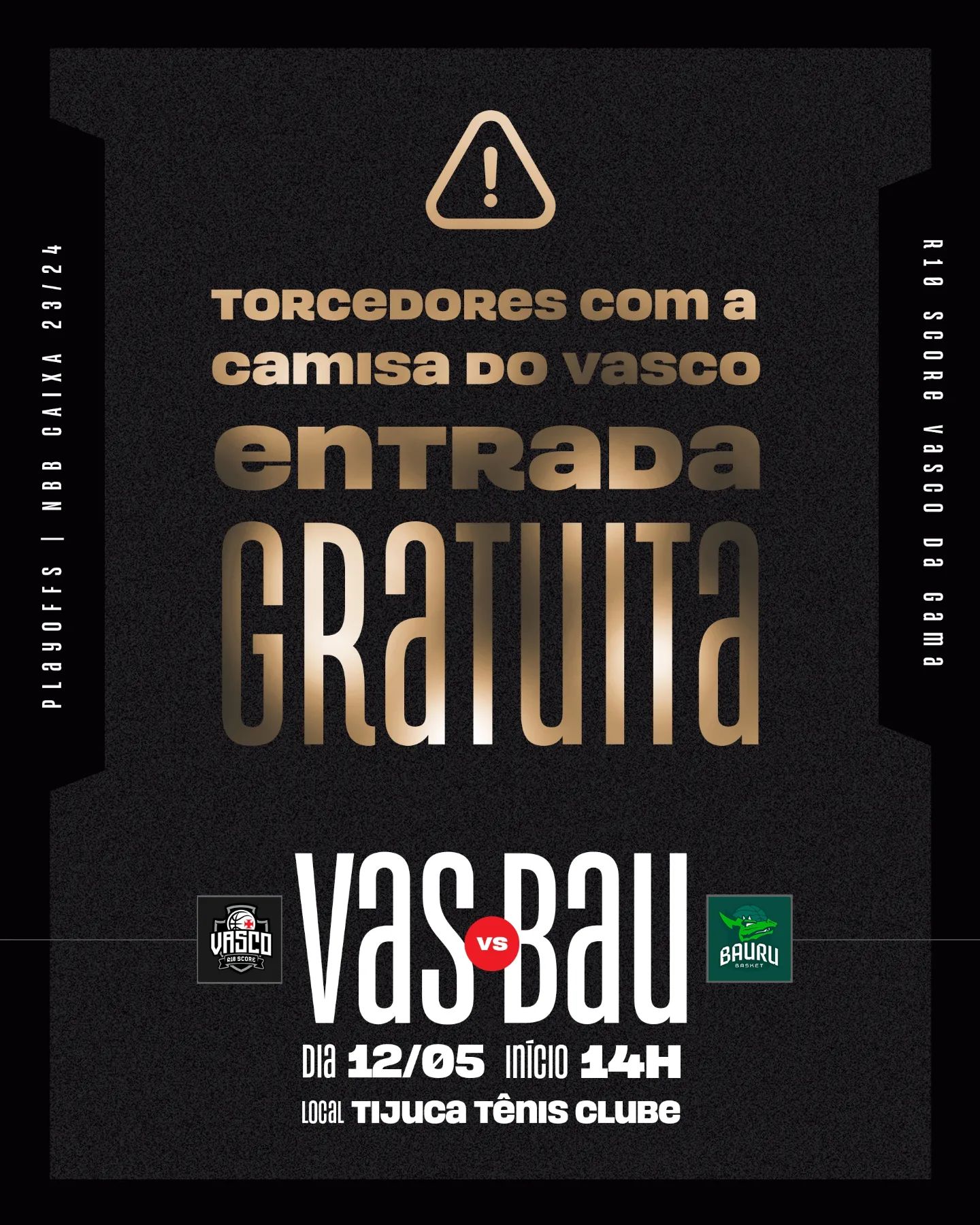 Portões abertos para todos os torcedores que estiverem com a camisa do Vasco para o jogo decisivo contra o Bauru, neste domingo, às 14h, no Tijuca. 🏀