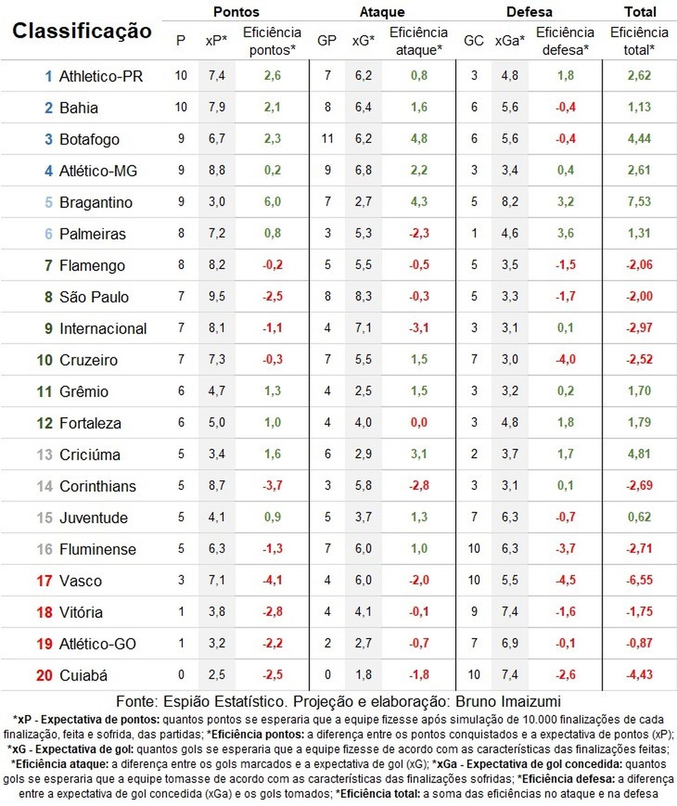 O indicador de "Gols Esperados" ou "Expectativa de Gols" (xG) é uma métrica consolidada na análise de dados que tem como referência mais de 84 mil finalizações cadastradas pelo Espião Estatístico em mais de 3,3 mil jogos de Brasileirões desde a edição de 2013. São consideradas a distância e o ângulo da finalização em relação ao gol, a parte do corpo utilizada para concluir, se a finalização foi feita de primeira ou foi ajeitada , se o chute foi feito com a perna boa ou ruim do jogador, assim como a origem do lance (se a partir de um cruzamento, falta direta, de uma roubada de bola, etc). Também são levados em conta o valor de mercado das equipes em cada temporada a partir de dados do site Transfermarkt, o tempo de jogo e a diferença no placar no momento de cada finalização.