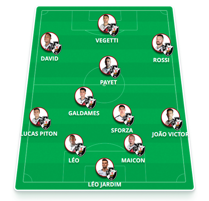 Provável escalação do Vasco: Léo Jardim, João Victor, Maicon, Léo, Lucas Piton, Sforza, Galdames, Payet, Rossi, David e Vegetti.