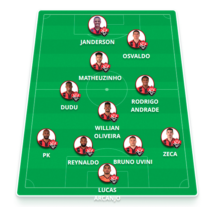 Provável escalação do Vitória: Lucas Arcanjo; Zeca (Willean Lepo), Bruno Uvini (Camutanga), Reynaldo e PK; Willian Oliveira, Dudu e Rodrigo Andrade; Matheusinho, Osvaldo e Janderson.