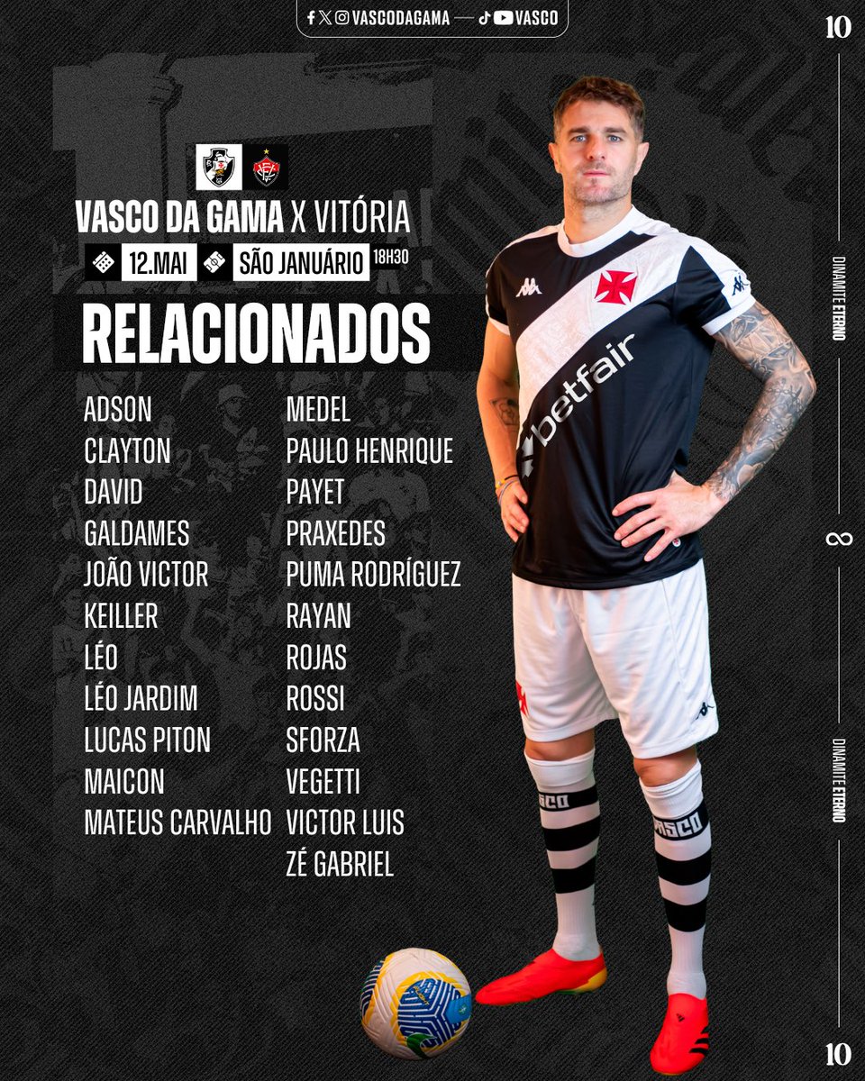 Vasco divulga os relacionados para o jogo contra o Vit贸ria
