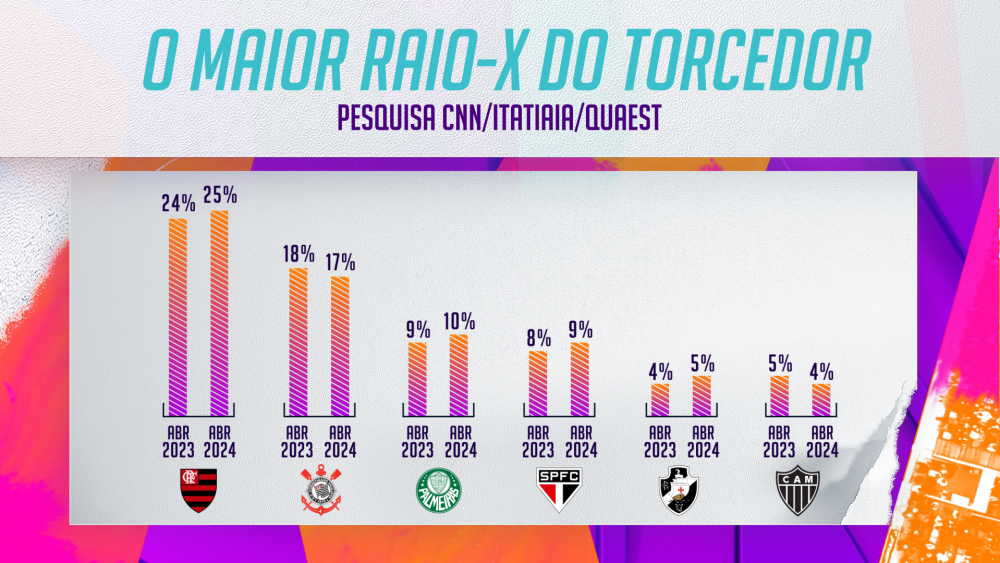 A pesquisa CNN/Itatiaia/Quaest divulgou crescimento nas torcidas de Flamengo, Palmeiras, São Paulo e Vasco em relação ao levantamento realizado do ano passado. Os quatro integram o top-5 das maiores torcidas do país, que conta ainda com o Corinthians - que apresentou queda no mesmo período.