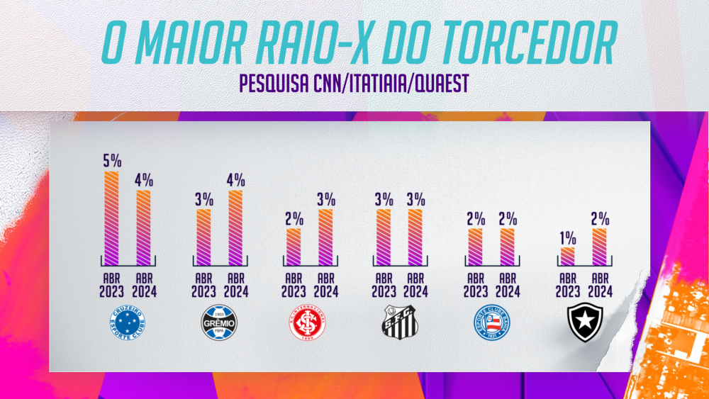 O Cruzmaltino contava com 4% da torcida no estudo de 2023, contra 5% de Galo e Cruzeiro. Agora a situação se inverteu, pois é o Vasco quem soma 5%, contra 4% dos dois rivais mineiros. É importante destacar que essa alteração está dentro da margem de erro da pesquisa, que é de 1,4 ponto percentual.