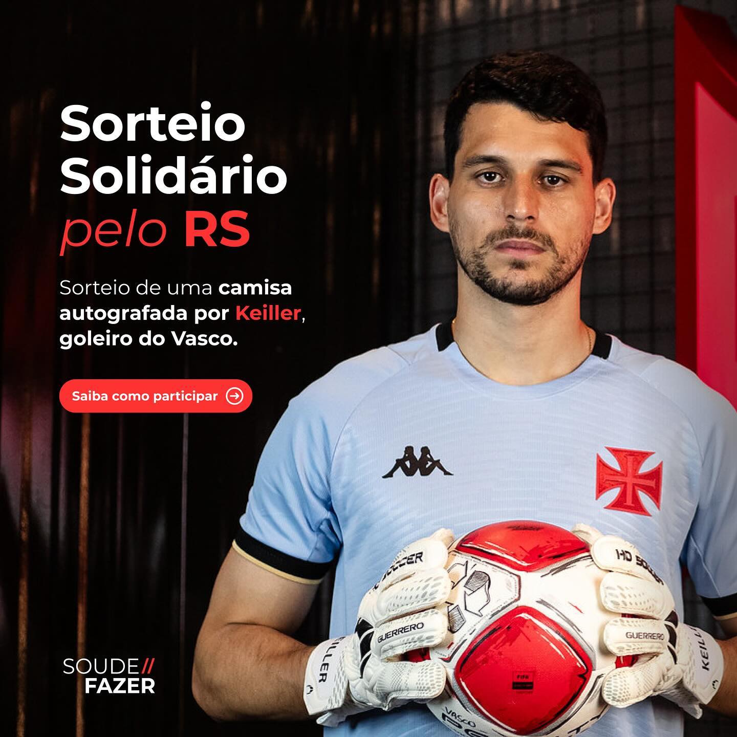 Com a sua doação você poderá ajudar milhares de famílias atingidas pela enchente no Rio Grande do Sul, e ainda participar do sorteio de uma camisa autografada pelo atleta Keiller, goleiro do Vasco!
