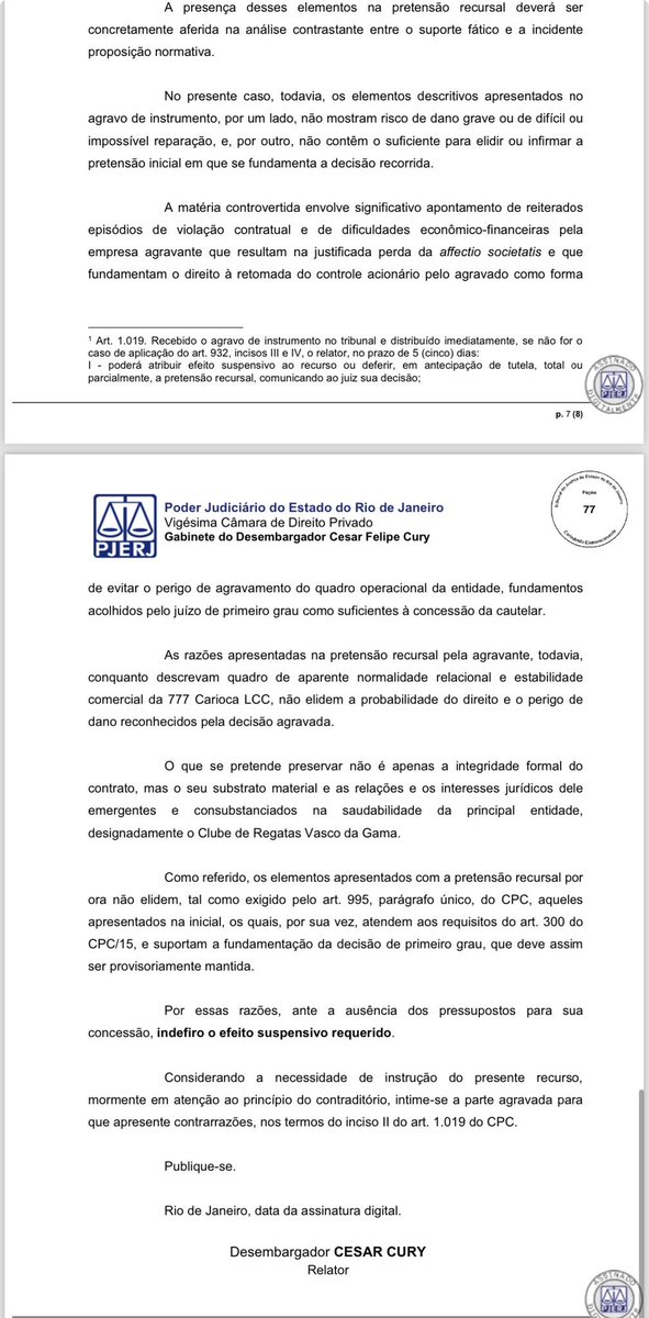 Desembargador acaba de negar os recursos da 777 e da Vasco SAF.