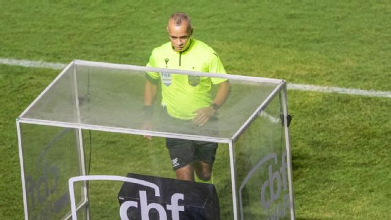 VAR: 'A bola vem de lá, ele domina na mão. É na mão. Wilton, te recomendo revisão de possível penal. O jogador bloqueia a bola com a mão no cruzamento.'