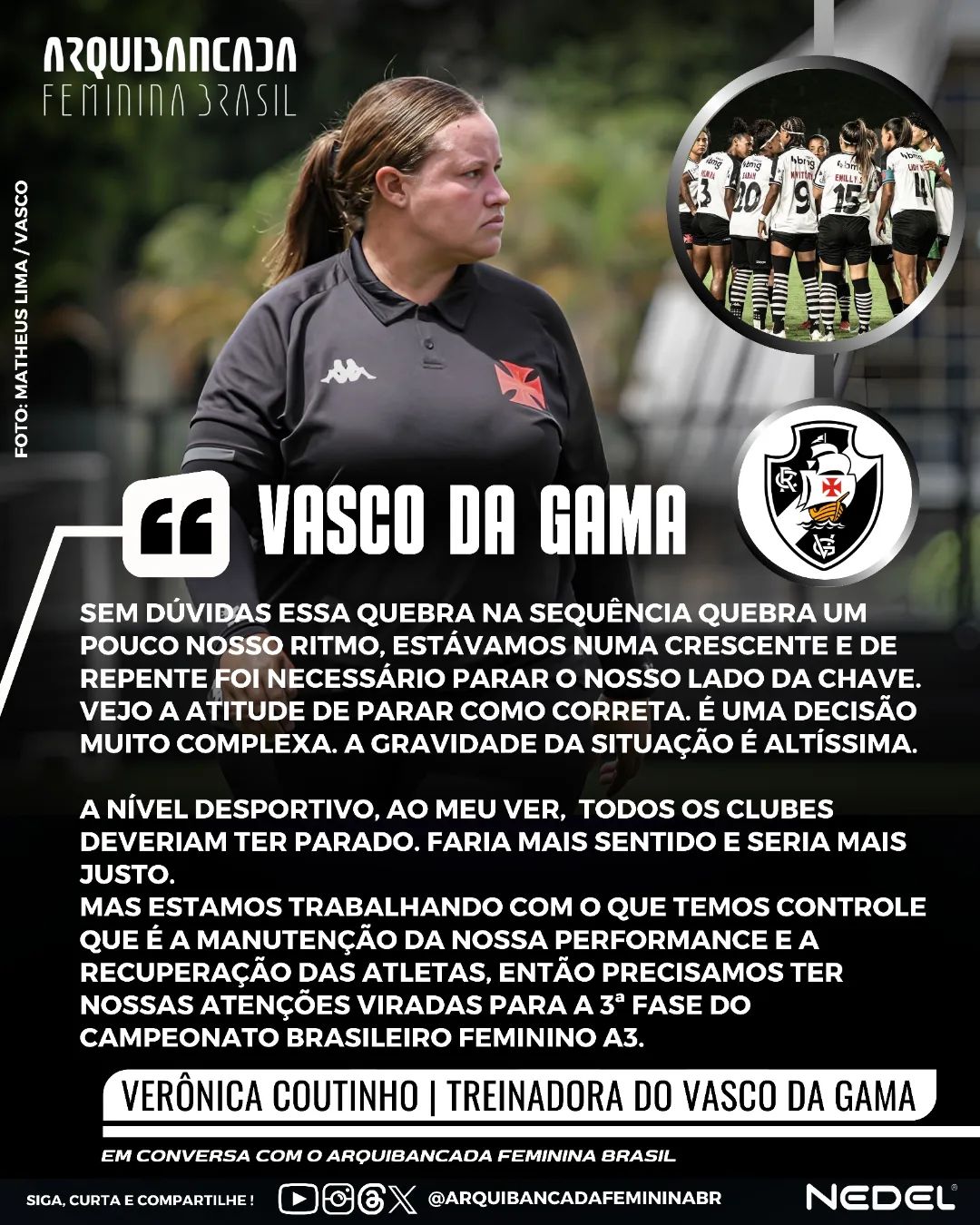 Em conversa com o Arquibancada Feminina Brasil, treinadora do @vasco_feminino, Verônica Coutinho @veronicacoutinho114 , falou um pouco sobre sua posição em relação à paralisação da sua chave no Brasileiro A3, enquanto a outra chave segue em andamento.