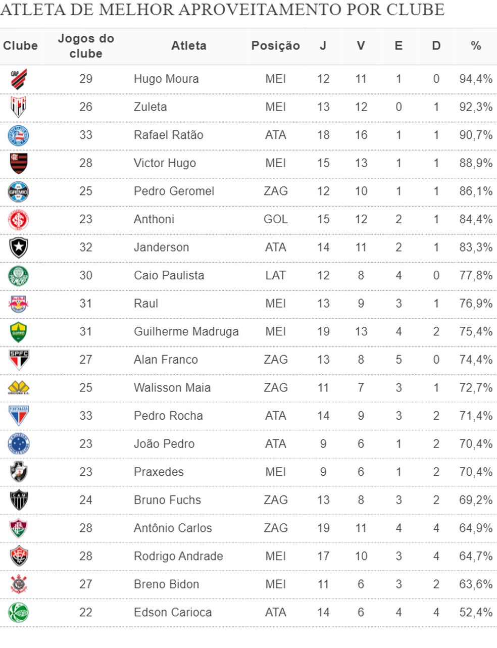 Por exemplo, 55 atletas tiveram 100% de aproveitamento por um mesmo clube, mas na média eles disputaram dois jogos na temporada. Desses atletas, o melhor desempenho é do lateral Patryck, que tem seis vitórias nos seis jogos em que entrou, mas no ranking entrou o zagueiro Alan Franco, que também está invicto, com oito vitórias e cinco empates em 13 partidas disputadas.
