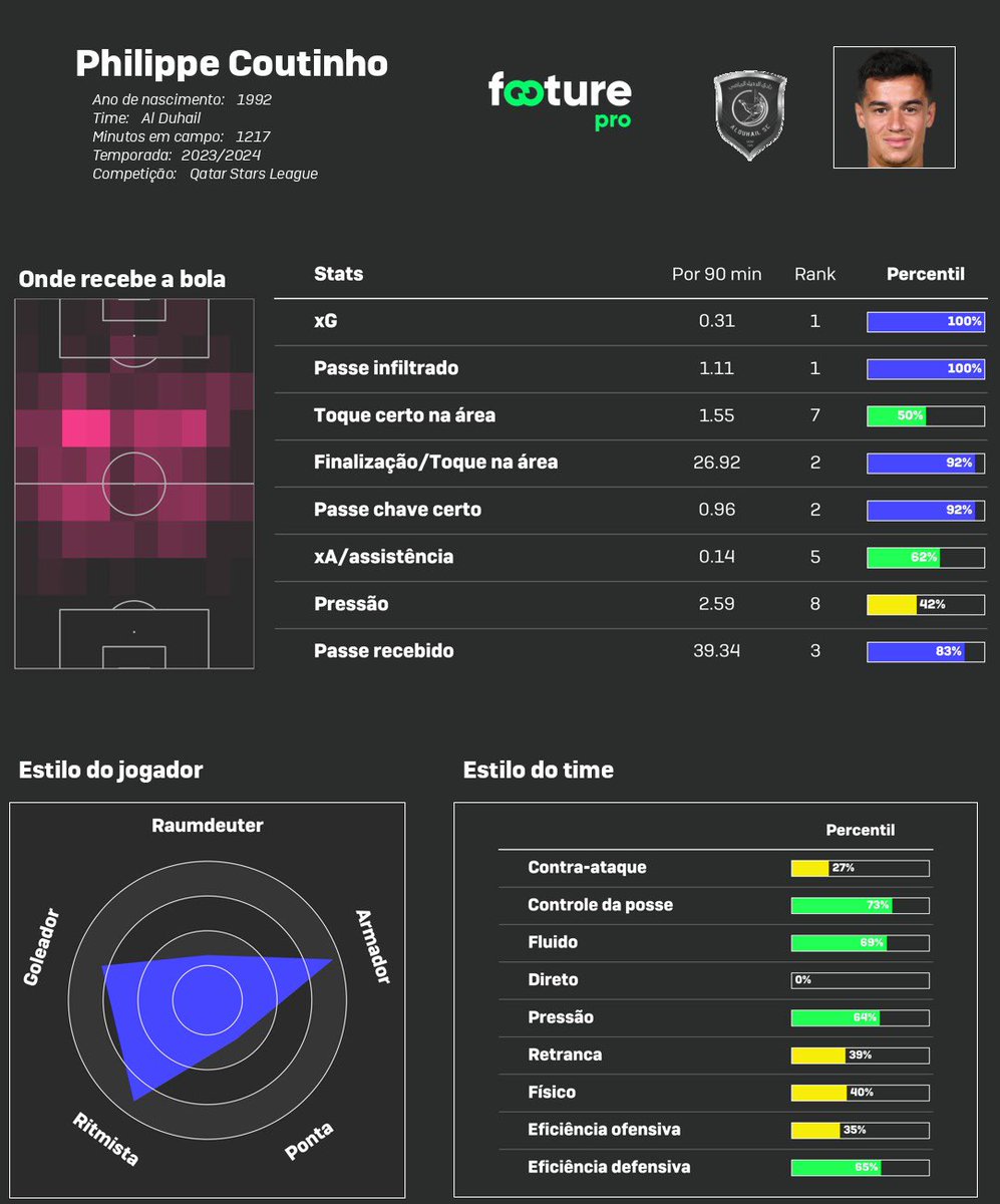🔝 Entre os meias da Liga do Catar, Coutinho foi o melhor em xG (0,31) e passes infiltrados (1,11) por jogo.
