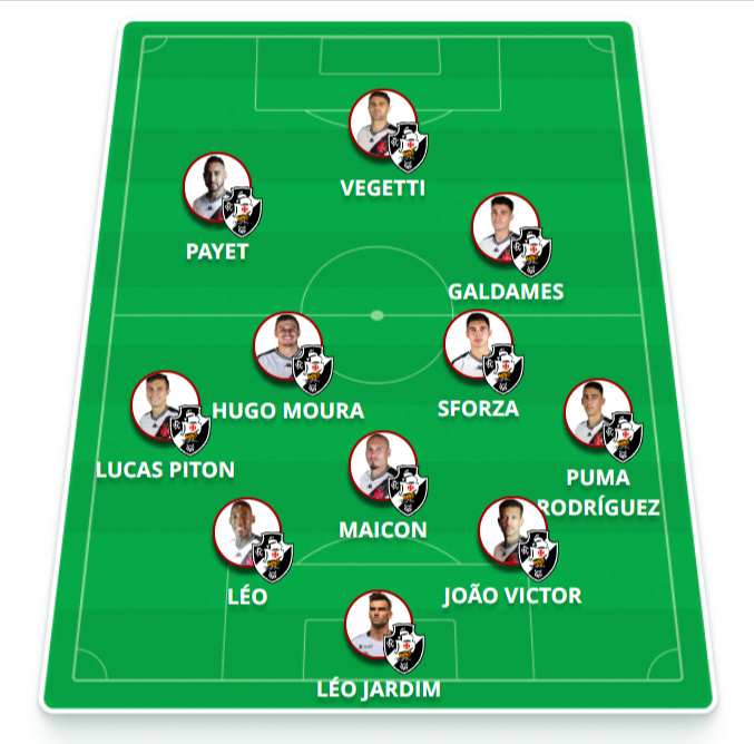 Provável escalação do Vasco: Léo Jardim, Puma (Paulo Henrique), João Victor, Maicon, Léo, Lucas Piton, Sforza, Galdames, Payet, Rayan (Hugo Moura) e Vegetti.