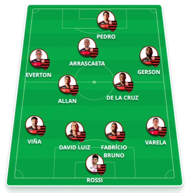 Provável escalação do Flamengo: Rossi, Varela, Fabrício Bruno, David Luiz e Viña; Allan, De la Cruz, Arrascaeta e Gerson; Everton Cebolinha e Pedro.