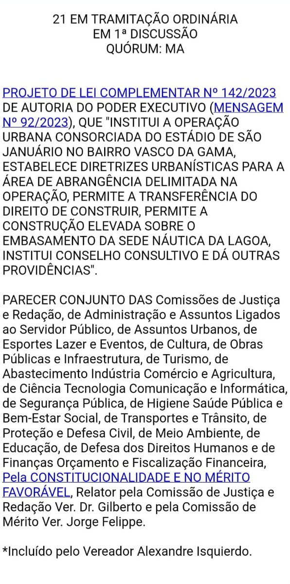 O Expresso 1923 teve acesso à pauta de votação da Câmara Municipal do Rio de Janeiro, que será publicada no Diário Oficial do Município nesta segunda, dia 3. Lá está inserido o Projeto de Lei Complementar No. 142/2023, conhecido como o PL do Potencial Construtivo de São Januário, que permitirá ao Vasco vender sua capacidade de construção de prédios altos no terreno de SJ, e com isso levantar até R$500 milhões para a reforma de nosso estádio.