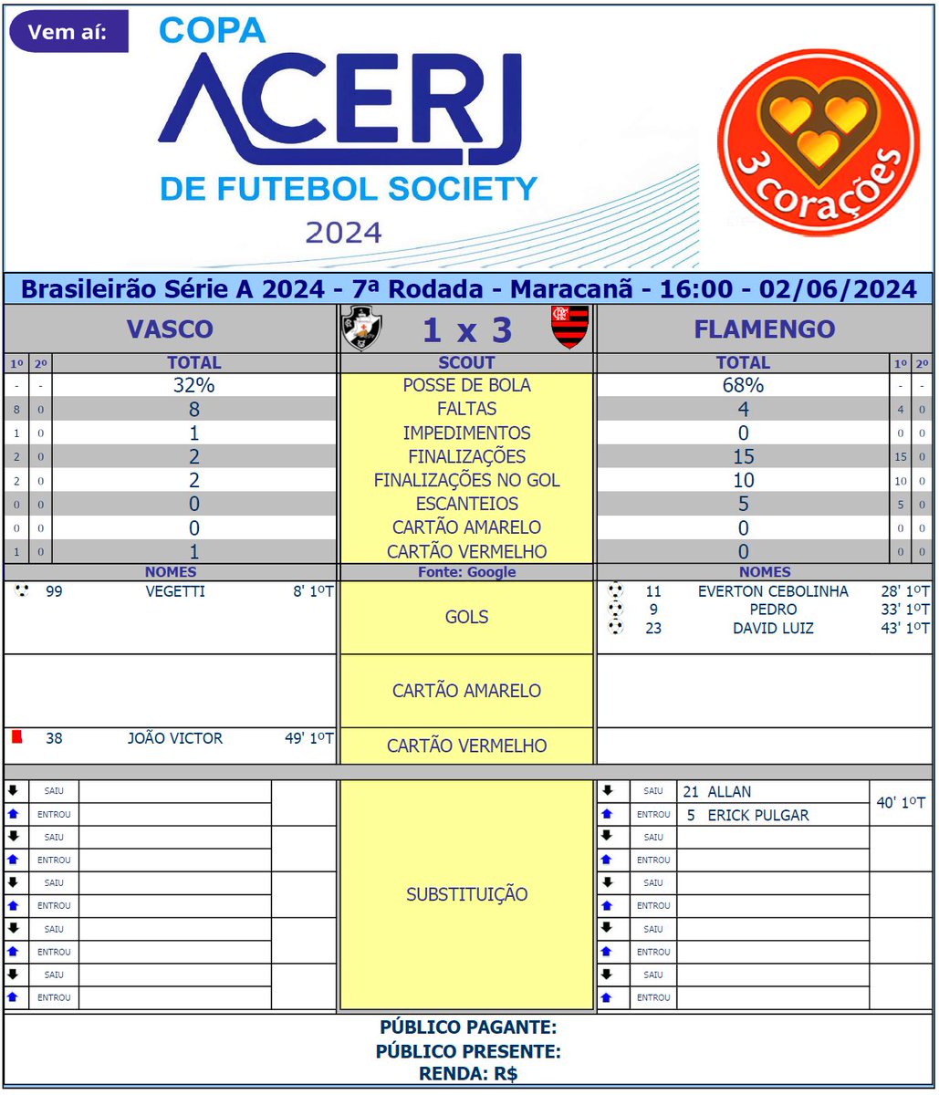 Scout do 1º Tempo de Vasco e Flamengo pela 7ª Rodada do Campeonato Brasileiro 2024 no Maracanã (Fonte: Google) #Acerjinforma #brasileirao2024 #VASxFLA #Vasco #Flamengo @Brasileirao @VascodaGama @Flamengo