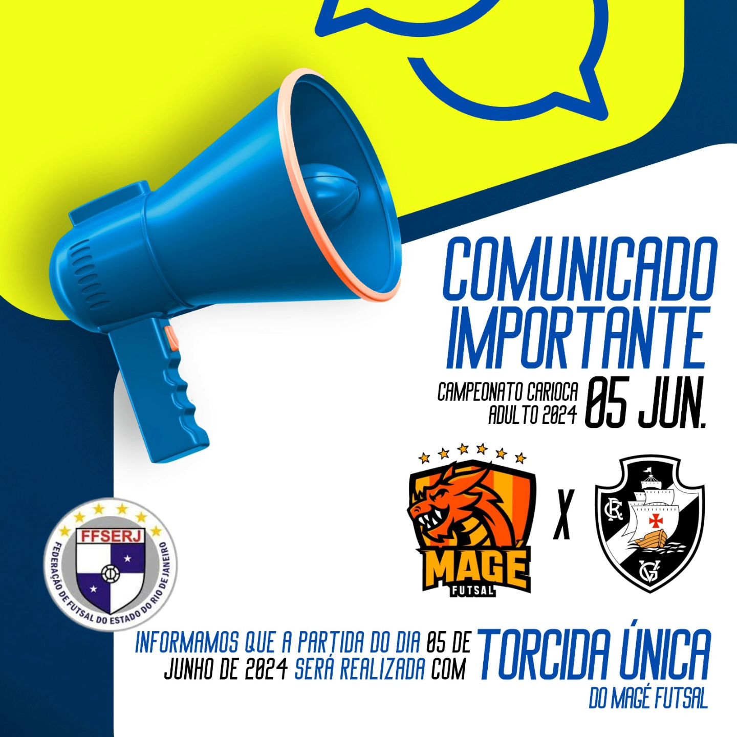 Em comum acordo entre as equipes envolvidas, o jogo de hoje entre Magé Futsal x CR Vasco da Gama, válido pelo campeonato Carioca Adulto 2024 TERÁ TORCIDA ÚNICA, apenas torcedores do Magé Futsal poderão assistir o jogo.
