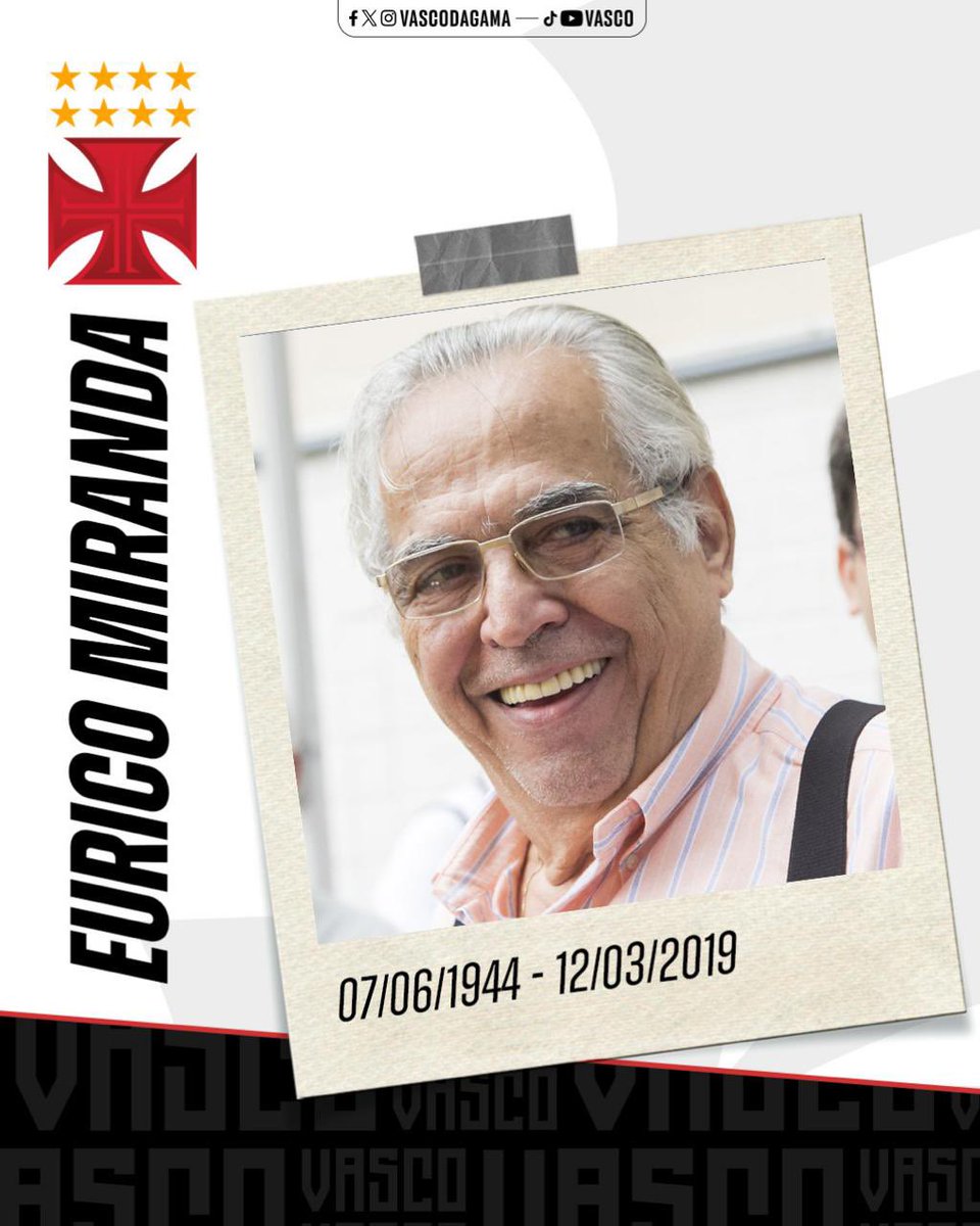 Vasco homenageia Eurico Miranda, que estaria completando 80 anos nesta 6ª-feira