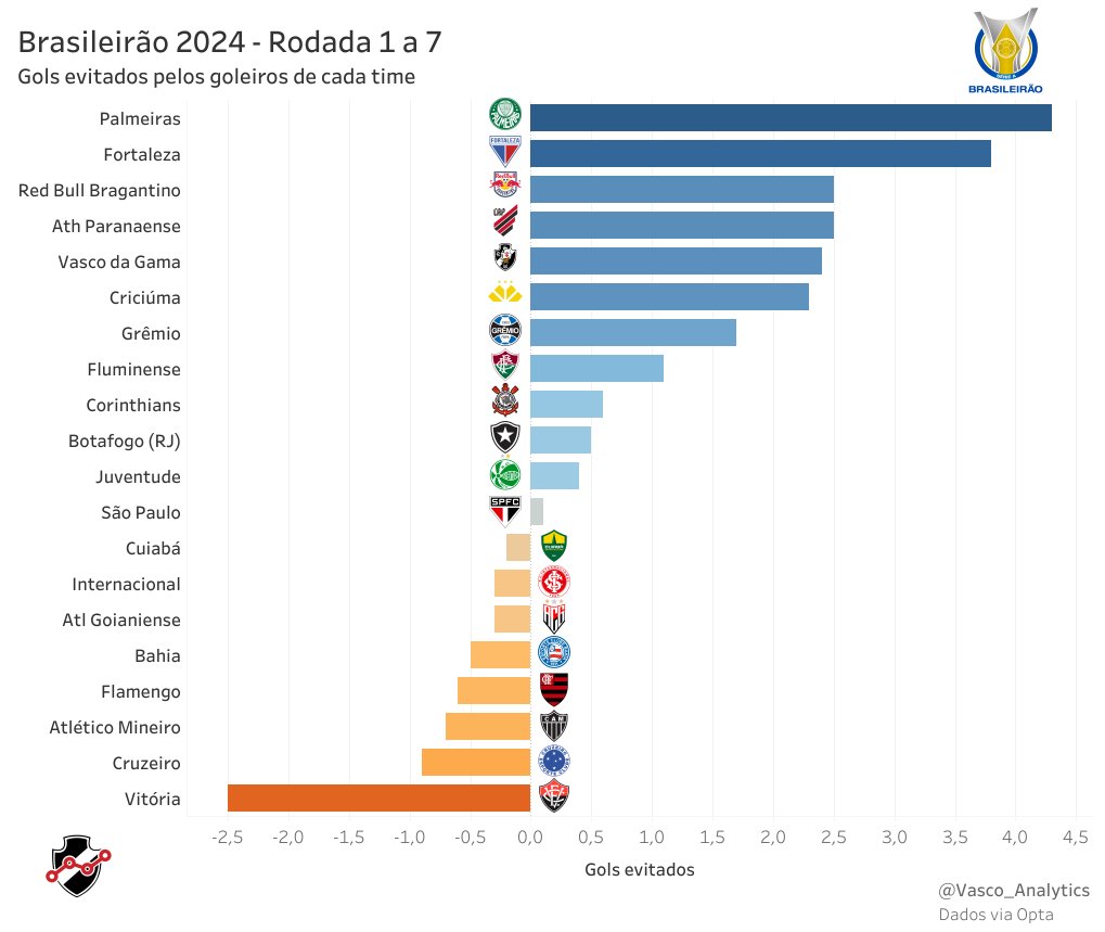 Brasileirão 2024 - Rodada 1 a 7 - Gols evitados pelos goleiros de cada equipe