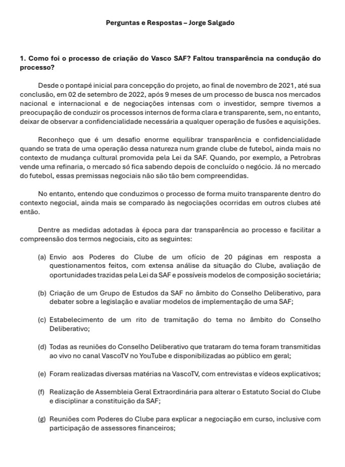 Ex-presidente Jorge Salgado divulga documento com 'perguntas e respostas' sobre a SAF