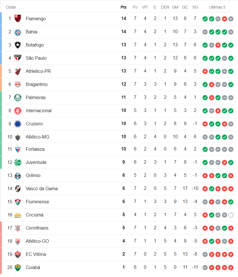 Em jogo reprogramado da 6ª rodada do Campeonato Brasileiro, o Criciúma recebe o Cuiabá neste domingo, às 16h, no Heriberto Hülse, em Criciúma. Se o time catarinense vencer, ultrapassará o Vasco na tabela, deixando o Gigante da Colina na 15ª colocação.