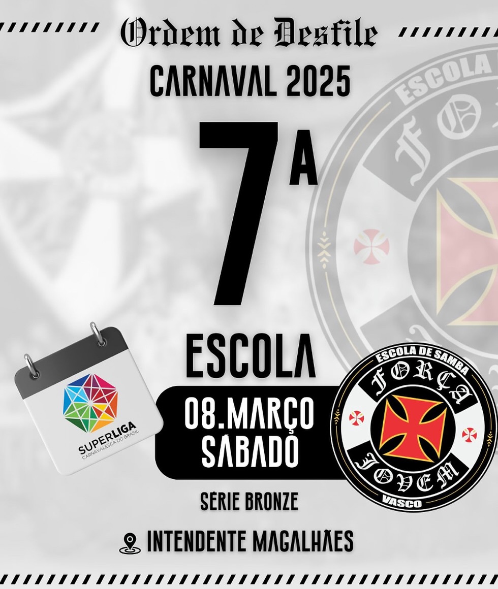 GRES Força Jovem será a 7ª escola a desfilar no dia 08/03 pela Série Bronze no Carnaval 2025