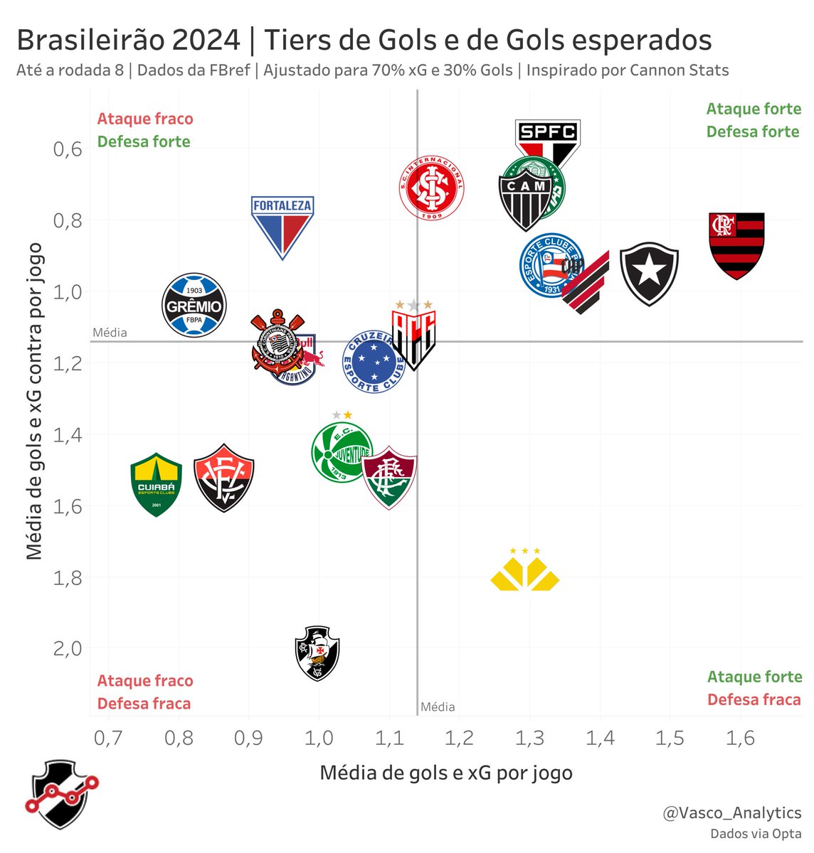 O Vasco aparece como a pior equipe defensivamente. Não é nenhuma surpresa. O time é extremamente desorganizado, com falta de compactação, peças que não se complementam e falta de combatividade em todos os setores. A janela vai precisar ser muito certeira para que o time consiga ter uma mínima identidade e organização em campo.