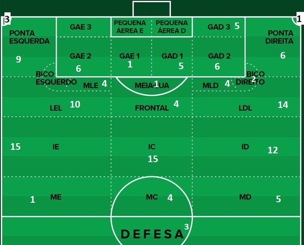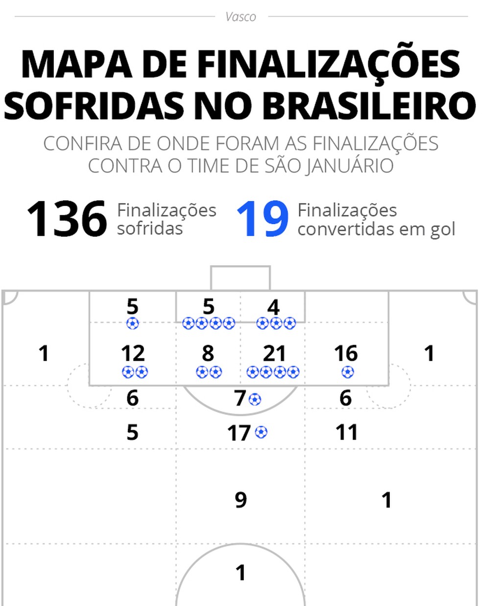 — O que está anormal nesse gráfico é essa parte frontal. São 17 finalizações ali, é muita coisa. É um número muito grande dentro desse universo. Isso vem desde o ano passado. Acho que tem a ver com duas coisas. A característica de alguns volantes do Vasco e a falta de sequência — disse Rodrigo Coutinho, comentarista do Grupo Globo.
