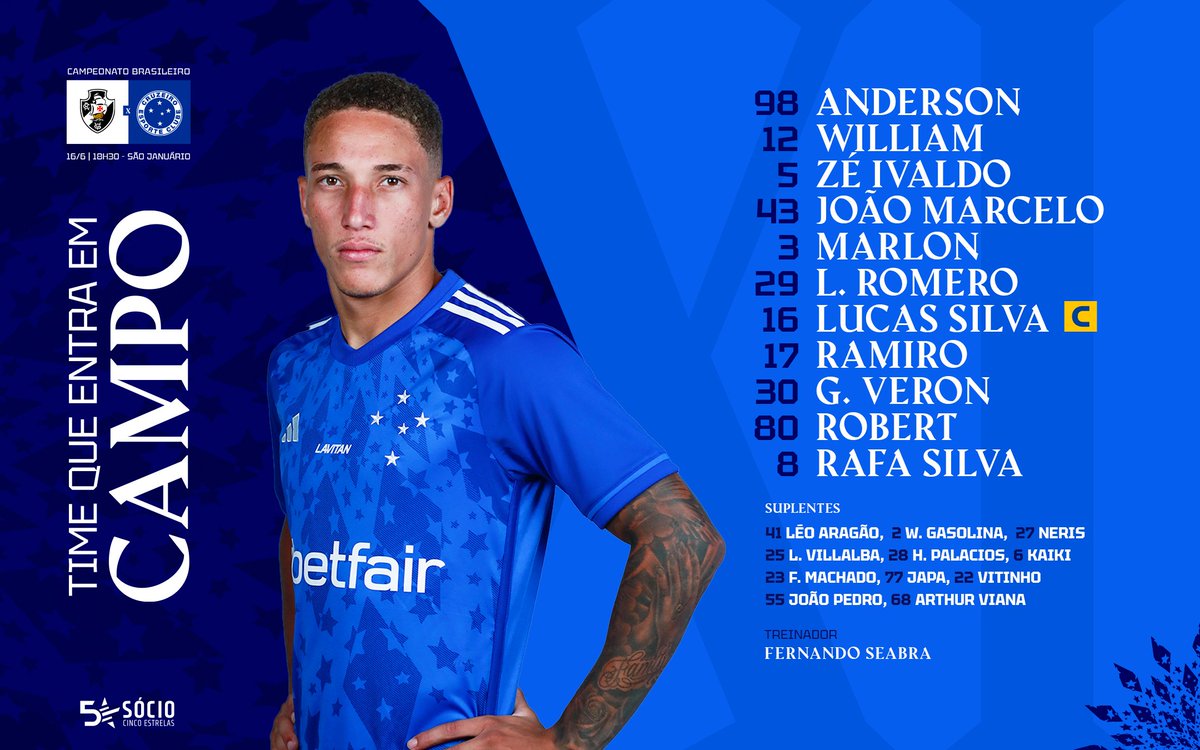 Veja a escalação do Cruzeiro para o jogo contra o Vasco
