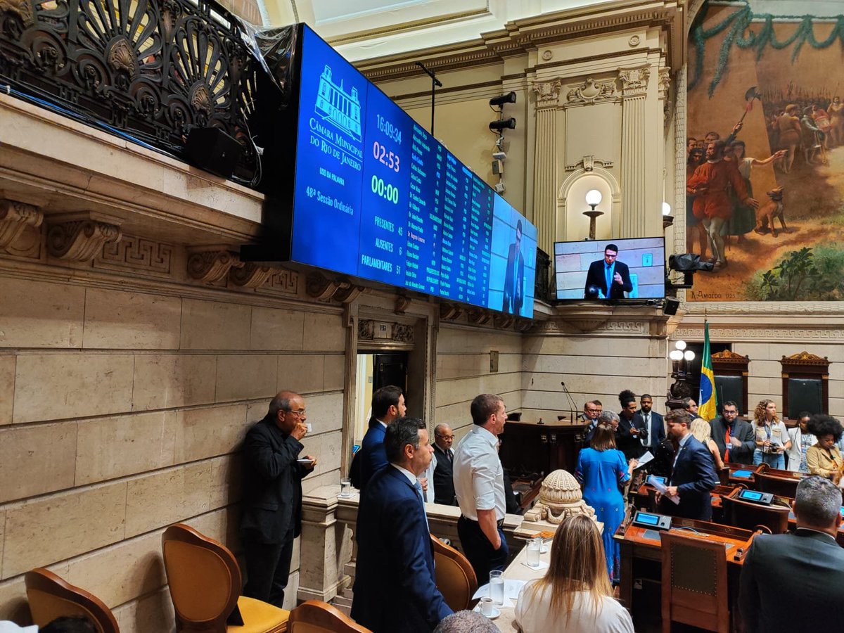 Sergio Dias, arquiteto responsável, Alan Belaciano, Renato Brito e Pedrinho presentes no plenário da Câmara.