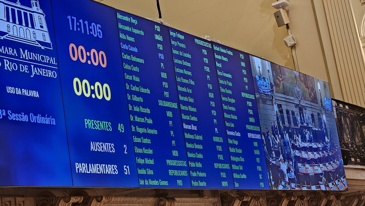 Apenas dois vereadores não estão presentes na sessão que vai votar o projeto de lei do potencial construtivo de São Januário: Marcos Braz (PL) e Veronica Costa (Republicanos).
