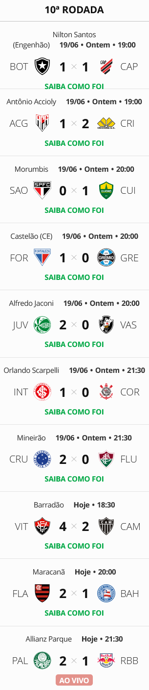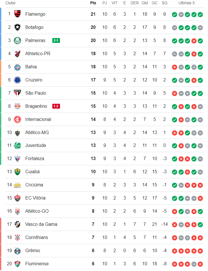 Terminada a 10ª rodada do Campeonato Brasileiro, o Vasco, que perdeu para o Juventude por 2 a 0, está na 17ª colocação, ou seja, na zona do rebaixamento.