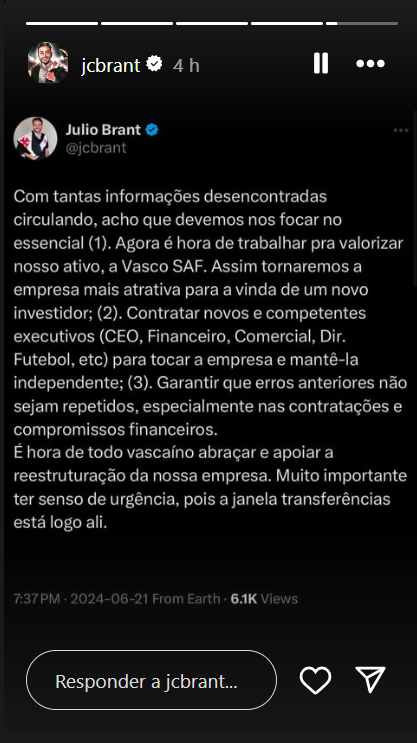 Julio Brant: 'Agora é hora de trabalhar para valorizar nosso ativo, a Vasco SAF'