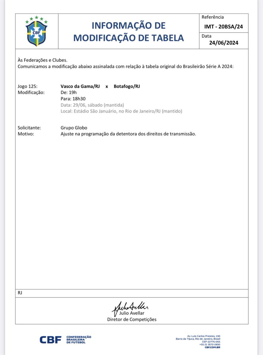CBF comunica que Vasco da Gama x Botafogo, que estava marcado para iniciar às 19h, irá iniciar às 18h30.