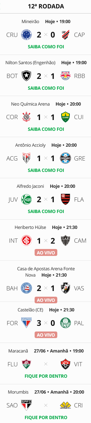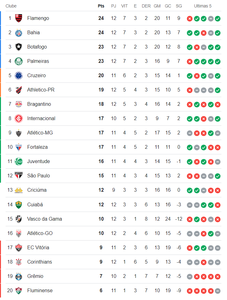 Terminados os jogos de 4ª-feira da 12ª rodada do Campeonato Brasileiro, o Vasco, que foi derrotado pelo Bahia por 2 a 1, segue na 15ª colocação e não terminará a rodada na zona do rebaixamento.