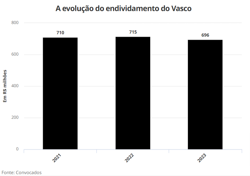 Em 2023, o endividamento do Vasco se manteve em R$ 696 milhões. O valor se divide entre dívidas bancárias (R$ 55 milhões), impostos e acordos (R$ 517 milhões) e dívidas operacionais (R$ 204 milhões), que estão ligadas a compromissos presentes, do próprio ano cruz-maltino.