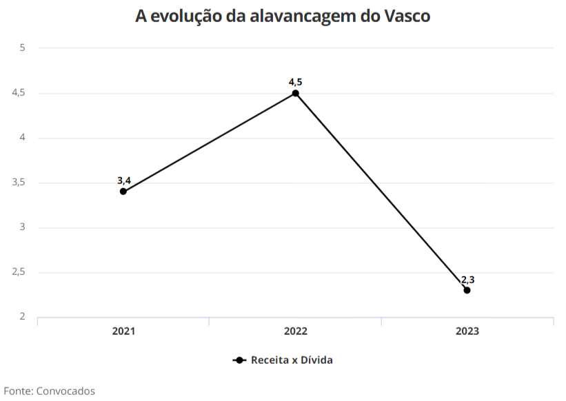 No gráfico abaixo, a Convocados mostra a "alavancagem" do clube, isto é, a comparação entre receita e dívida. Quanto menor for o número, menos alavancada a entidade está — o que indica que há condições favoráveis para novos investimentos em atletas, infraestrutura, base etc.
