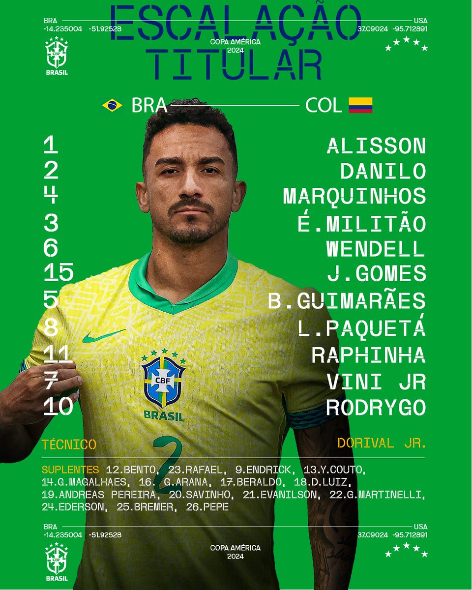 Escalação oficial da Seleção Brasileira para o jogo de hoje (02) contra a Colombia, na Copa América. A partida tem início às 22h (horário de Brasília) e será transmitida pela TV Globo (canal fechado) e Sportv (canal aberto).