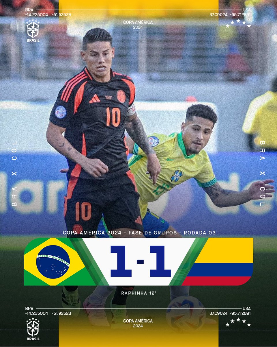 Em tarde pouco inspirada no Levi's Stadium, em Santa Clara, o Brasil só empatou com a Colômbia por 1 a 1 e passou às quartas de final da Copa América no segundo lugar do Grupo D. O gol brasileiro foi marcado por Raphinha, ainda no início do primeiro tempo, mas Muñoz deixou tudo igual nos acréscimos da etapa inicial e garantiu a liderança aos colombianos.