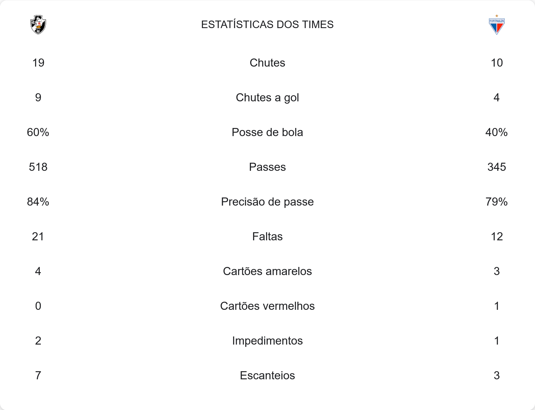 Confira as estatísticas de Vasco 2 x 0 Fortaleza