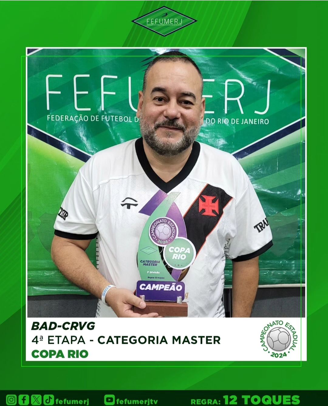 No CT do Botafogo, o Campeonato Estadual Individual da Regra 12 toques, categoria máster (48+), teve continuidade neste sábado(6/7), com a disputa da 4ª Etapa(Copa Rio) e o título de Bad, agora novamente jogador do Vasco da Gama.