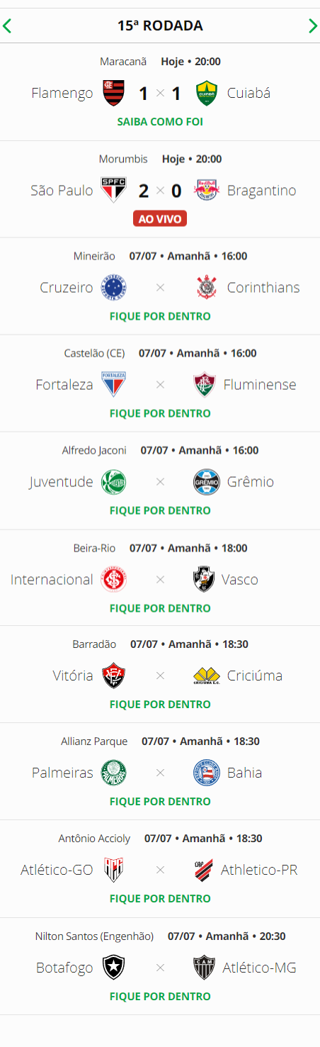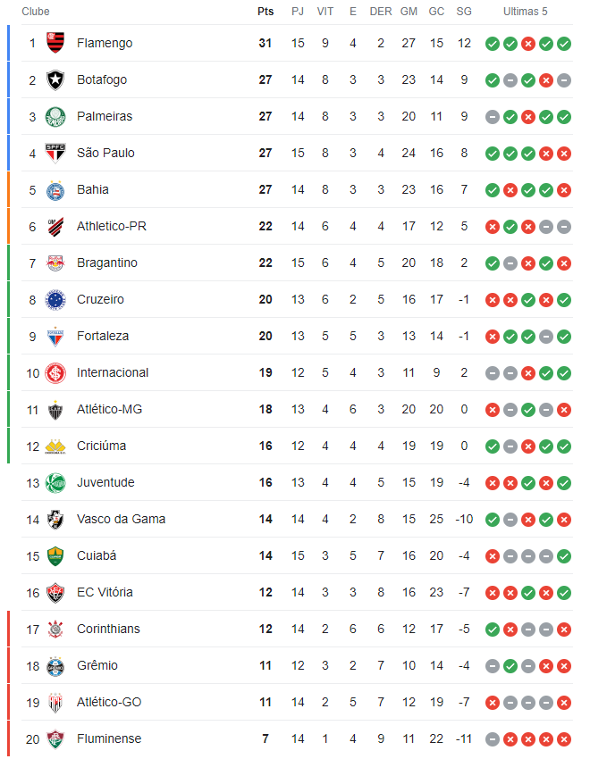 Terminados os jogos deste sábado da 15ª rodada do Campeonato Brasileiro, o Vasco, que enfrenta o Internacional, segue na 14ª colocação.