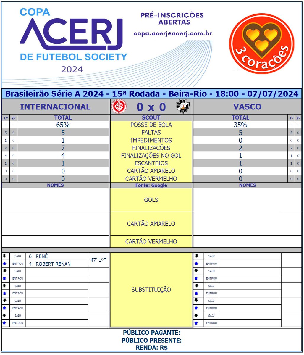 Scout do 1º Tempo de Internacional e Vasco pela 15ª Rodada do Campeonato Brasileiro 2024 no Beira-Rio (Fonte: Google) #Acerjinforma #brasileirao2024 #INTxVAS #SCInternacional #Vasco @Brasileirao @SCInternacional @VascodaGama