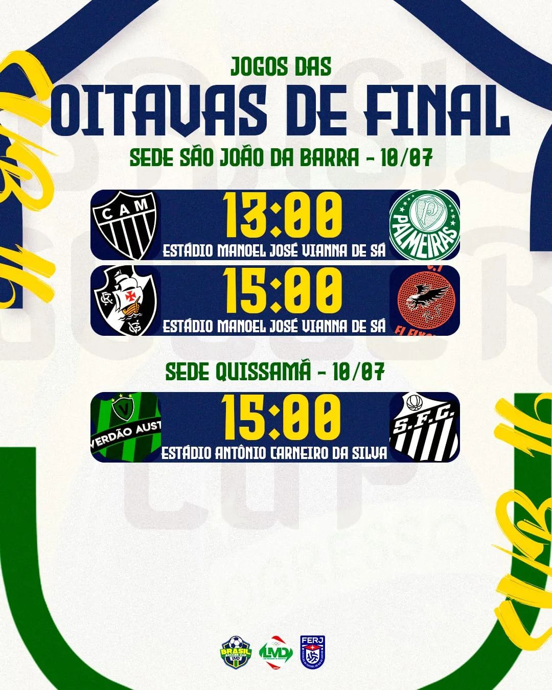 Horários dos jogos das OITAVAS DE FINAL nesta quarta-feira (10) nas sedes de SÃO JOÃO DA BARRA e QUISSAMÃ. Fiquem atentos aos horários e venham ao estádio prestigiar esse grande evento de nível nacional.