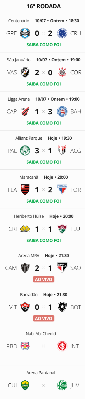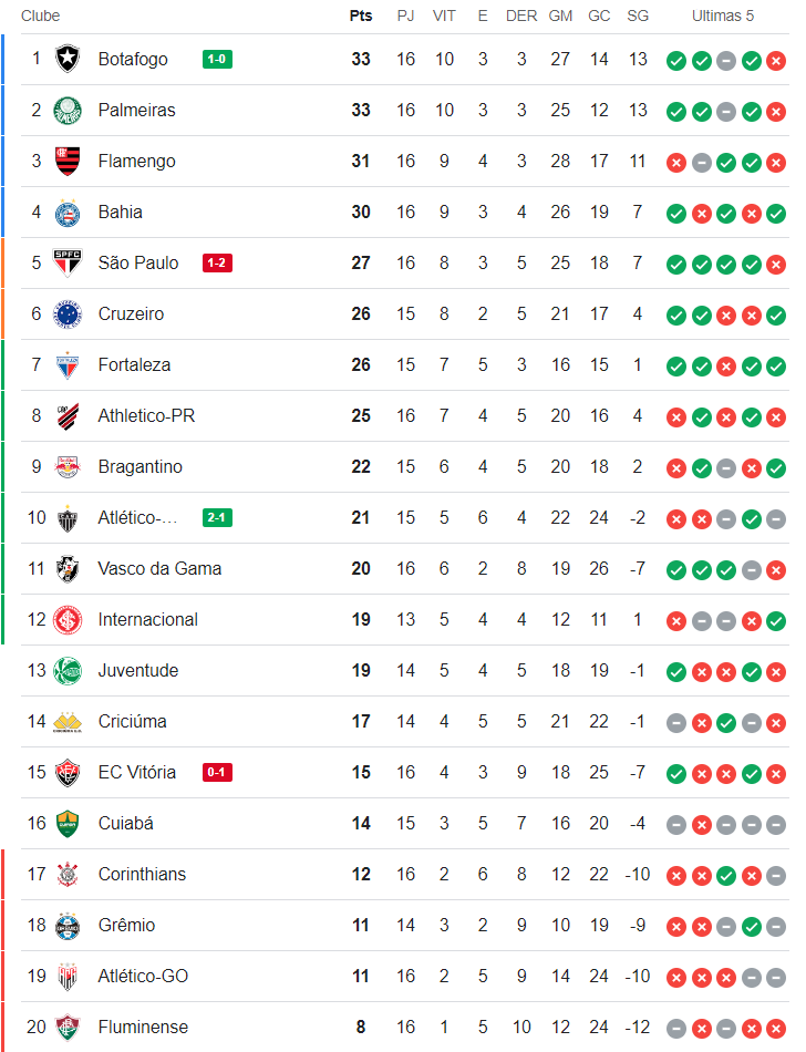 A 2 jogos para o fim da 16ª rodada do Campeonato Brasileiro (Bragantino x Inter e Cuiabá x Juventude, adiados e ainda sem data definida), o Vasco, que derrotou o Corinthians por 2 a 0, subiu para a 11ª colocação. O Gigante da Colina está, agora, em número de pontos, mais perto do G6 (6 pontos abaixo) do que do Z4 (8 pontos acima).