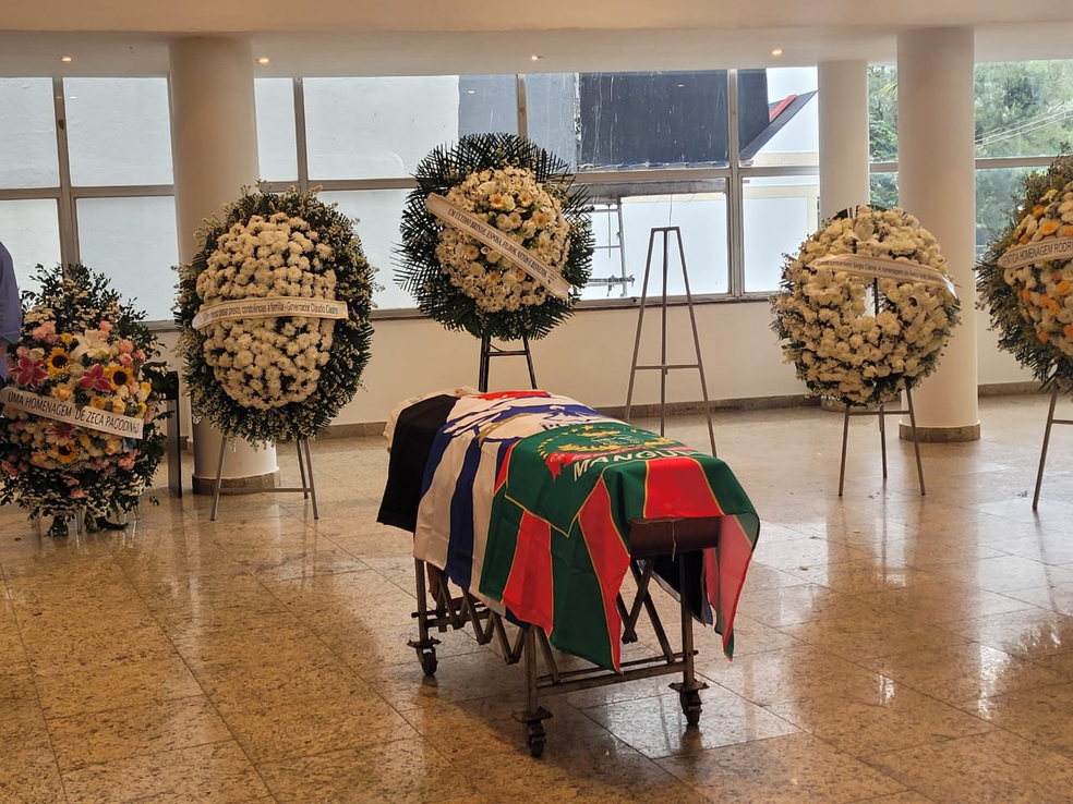 O caixão com o corpo do jornalista é coberto pela bandeira do clube do coração, e das escolas de samba Portela e Mangueira.