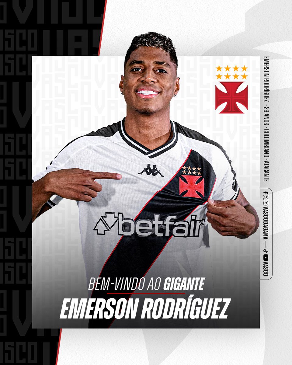 O Vasco da Gama chegou a um acordo com o atacante Emerson Rodríguez para temporada 2024. O jogador, que estava no Millonarios (COL), chega por empréstimo pelo Inter Miami (EUA). Ele assinou contrato com o Gigante até junho de 2025 e a transferência será finalizada na próxima quinta-feira (18), data de abertura da janela de transferências Fifa nos Estados Unidos.