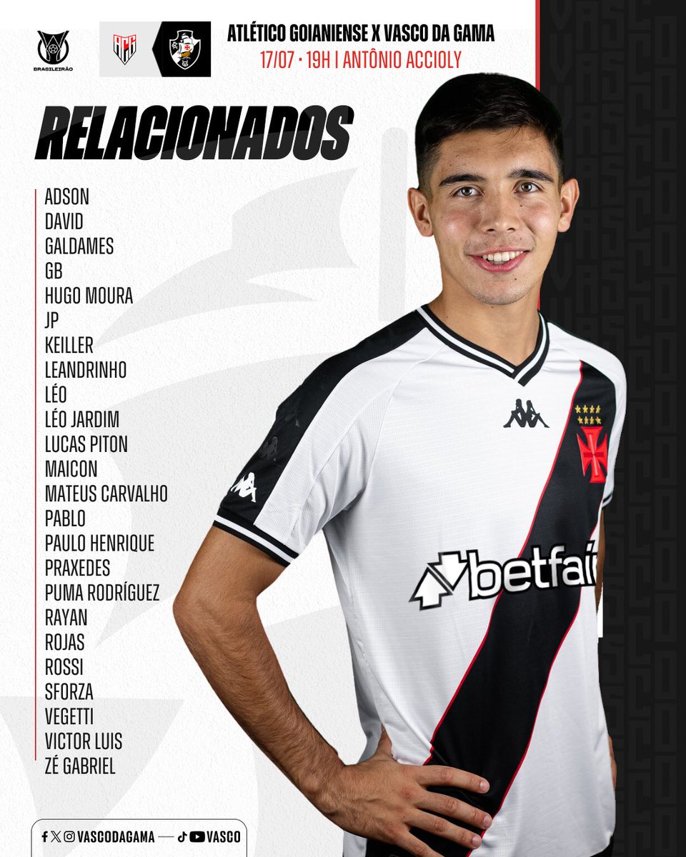 Vasco divulga os relacionados para o jogo contra o Atlético-GO e informa situações médicas de João Victor, Payet e Estrella