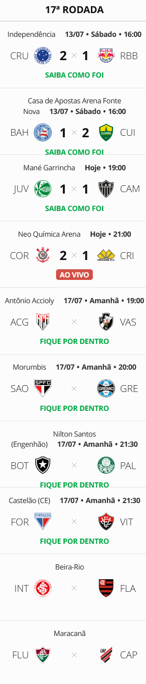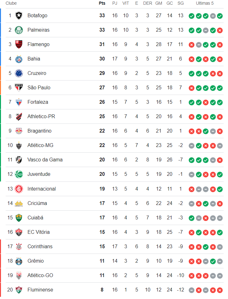 Após os jogos de 3ª-feira da 17ª rodada do Campeonato Brasileiro, o Vasco segue na 11ª posição. O Gigante da Colina enfrenta o Atlético-GO nesta 4ª-feira, às, em Goiânia.