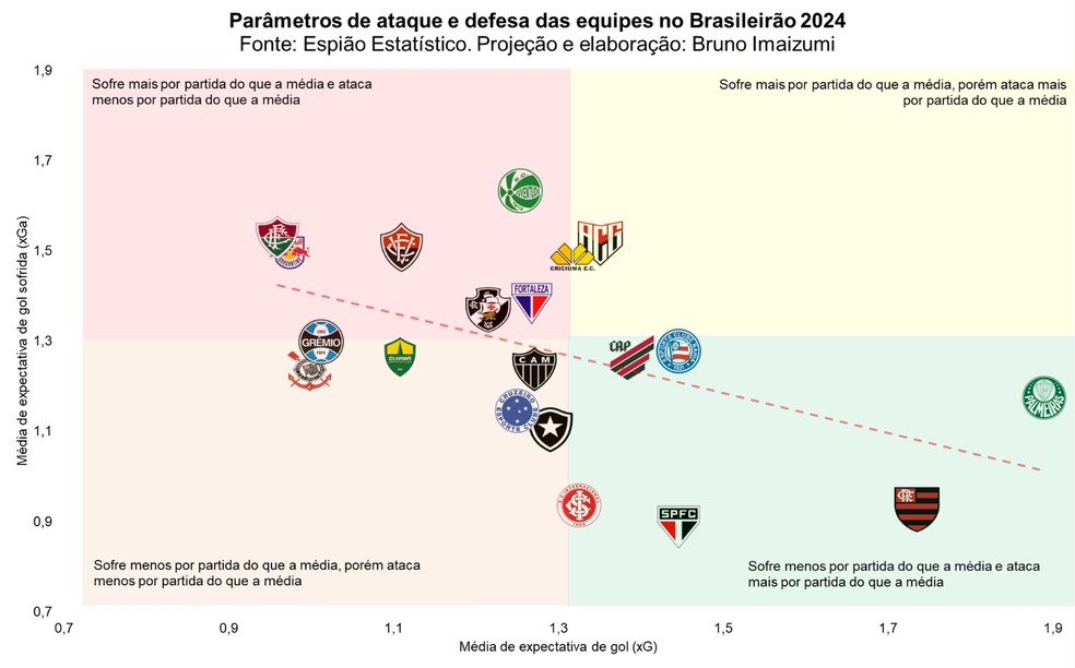 É possível representar em um gráfico os níveis médios de ameaça que ataques impõem por jogo aos adversários e que as defesas sofrem a partir da métrica estatística de xG, a expectativa que cada finalização tem de virar gol quando consideradas as características de cada arremate, afinal, um chute da intermediária tem em média chances menores de entrar no gol do que uma conclusão de dentro da pequena área sem goleiro: ambas contam como uma finalização, mas com potenciais muito diferentes entrar no gol, e o xG leva tudo em consideração.